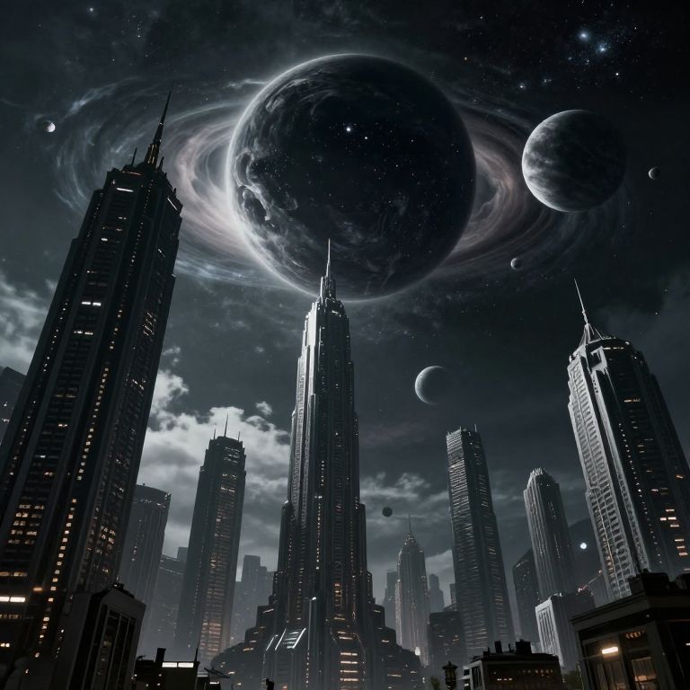 High Speed A dark fantasy city, dark mighty towers, Islamic, Muslim fantasy, Mysterious creatures, Three moons, great stars,