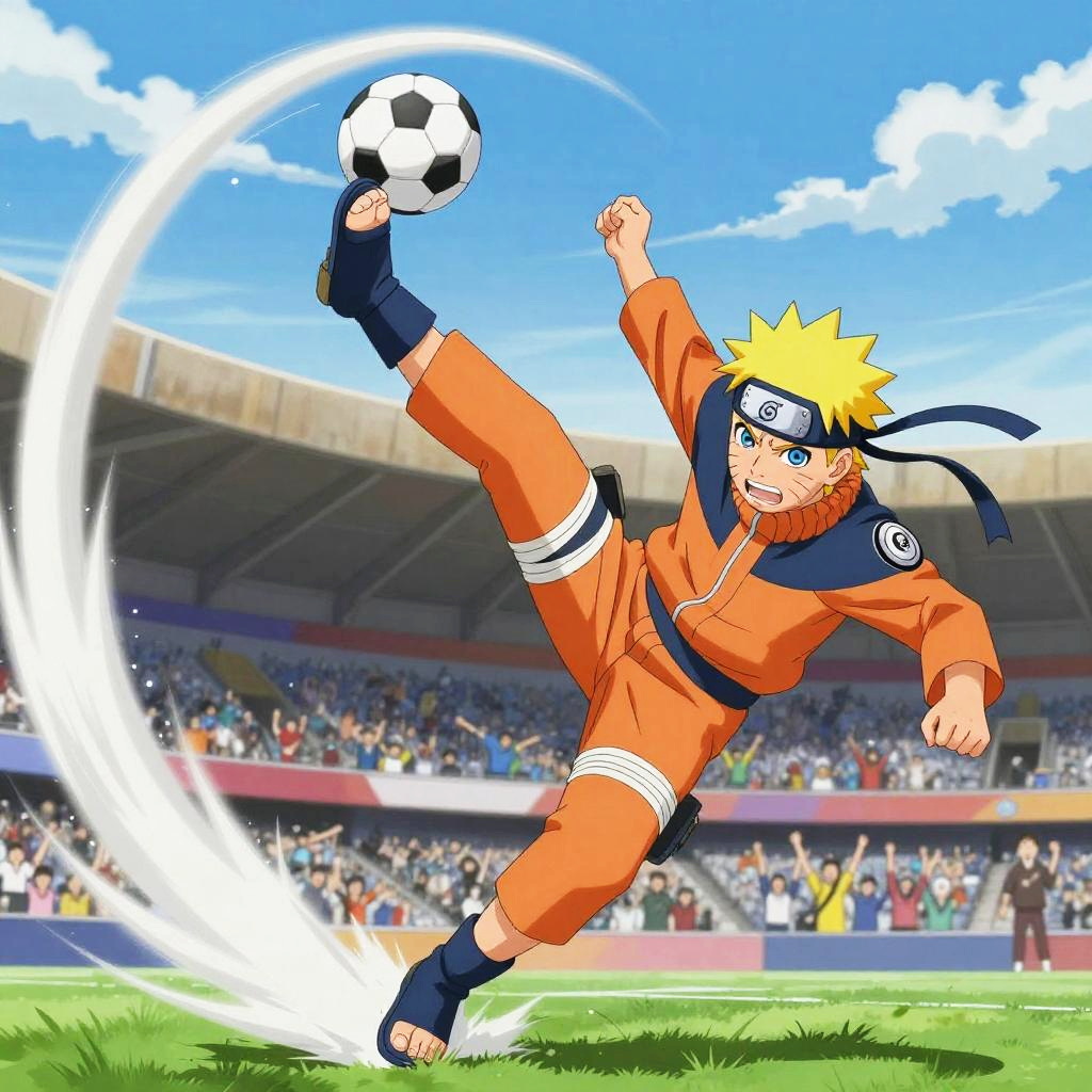Soccer Naruto performing an acrobatic mid-air kick, combining ninja agility and soccer skills, detailed anime rendering with swirling wind effects and cheering fans in stands