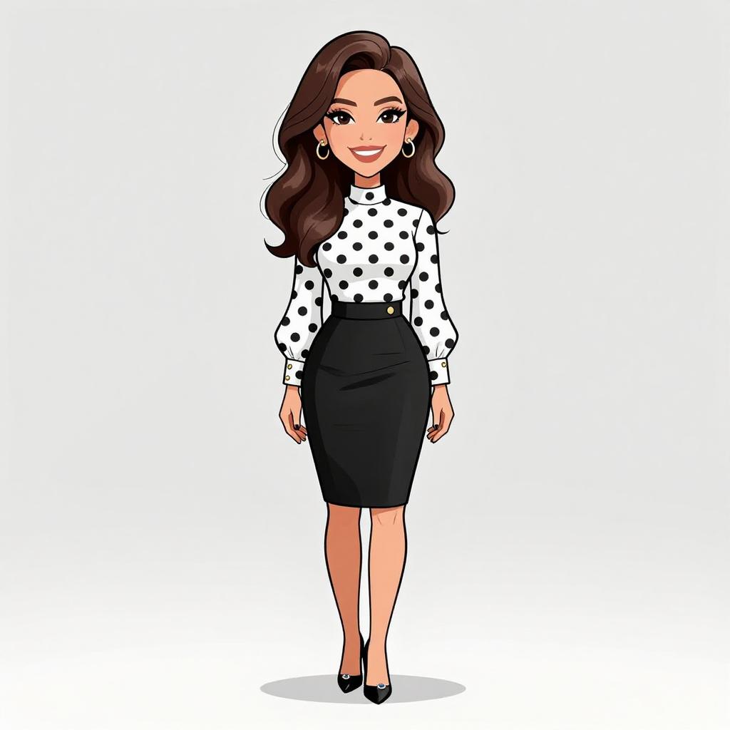 Digital illustration of a smiling woman with long brown hair, wearing a black blouse with puffed sleeves, black-and-white houndstooth skirt, and