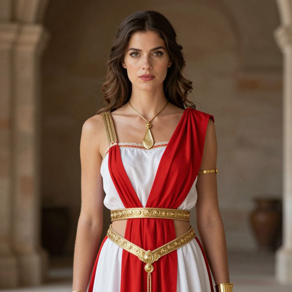Roman Goddess Costume Woman, a woman in a red and white dress with a gold tia