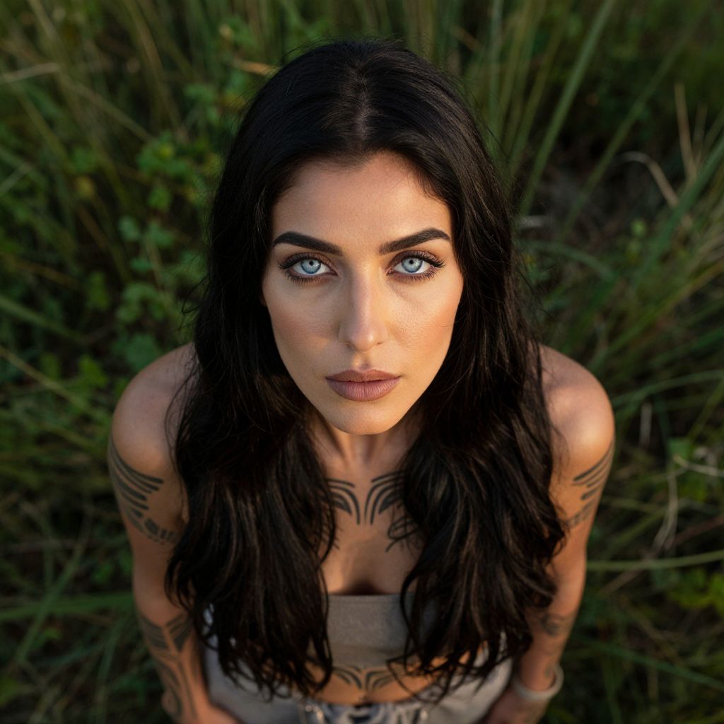 Photograph of a woman with striking blue eyes and long, wavy black hair, gazing directly at the camera. She has dark, arched eyebrows, full lips with mauve lipstick, and a light olive skin tone. Her chest is adorned with black tribal tattoos. She is wearing a strapless top, revealing her cleavage. The background features a dense, green, grassy field with tall blades of grass. The image is taken from an overhead perspective, emphasizing her intense, captivating gaze. The lighting highlights her facial features and tattoos, creating a dramatic contrast with the dark green background.