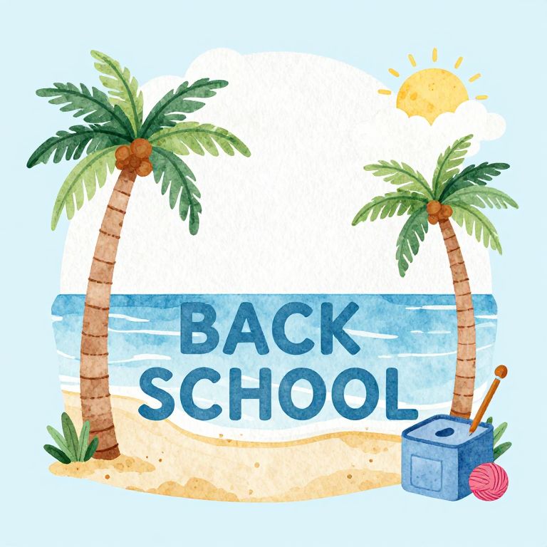 Knitting a watercolor illustration of a back to school theme in a tropical location, vector style, simple style,
