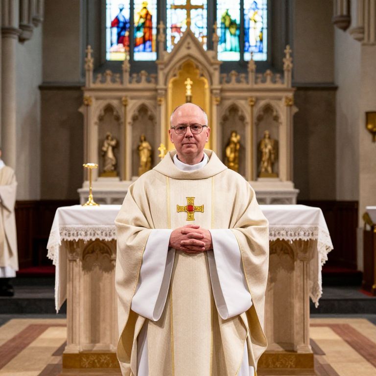 Photograph of a bald, middle-aged Catholic priest in cream vestments with a red cross, standing in a ornate, stained glass-lit church