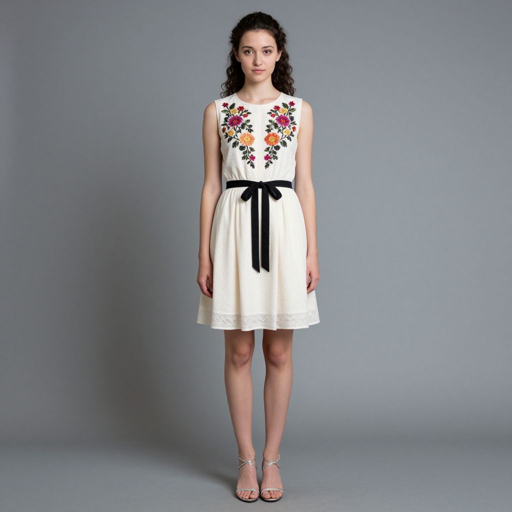 Photograph of a young woman standing against a gray background. She has fair skin, dark curly hair tied back, and is wearing a sleeveless, knee-length, ivory dress with a black ribbon belt. The dress features colorful floral embroidery on the chest. She's also wearing strappy, silver high heels. She stands with a neutral expression, arms relaxed by her sides.