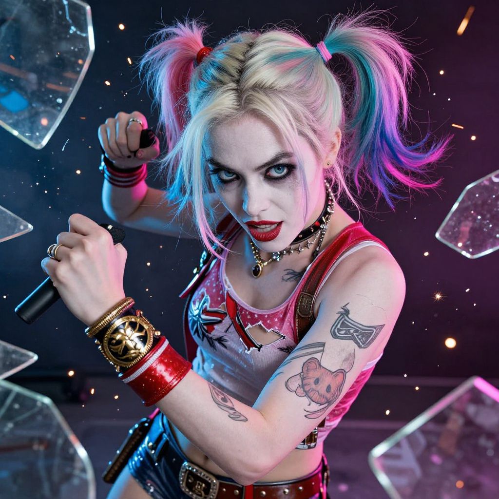 Hyper realistic Harley Quinn in chaotic battle stance, torn clothes revealing tattoos, vibrant pastel hair flying wildly, shattered glass and sparks around, high contrast lighting with blue and pink hues, intense eyes with depth, detailed skin textures and costume elements.