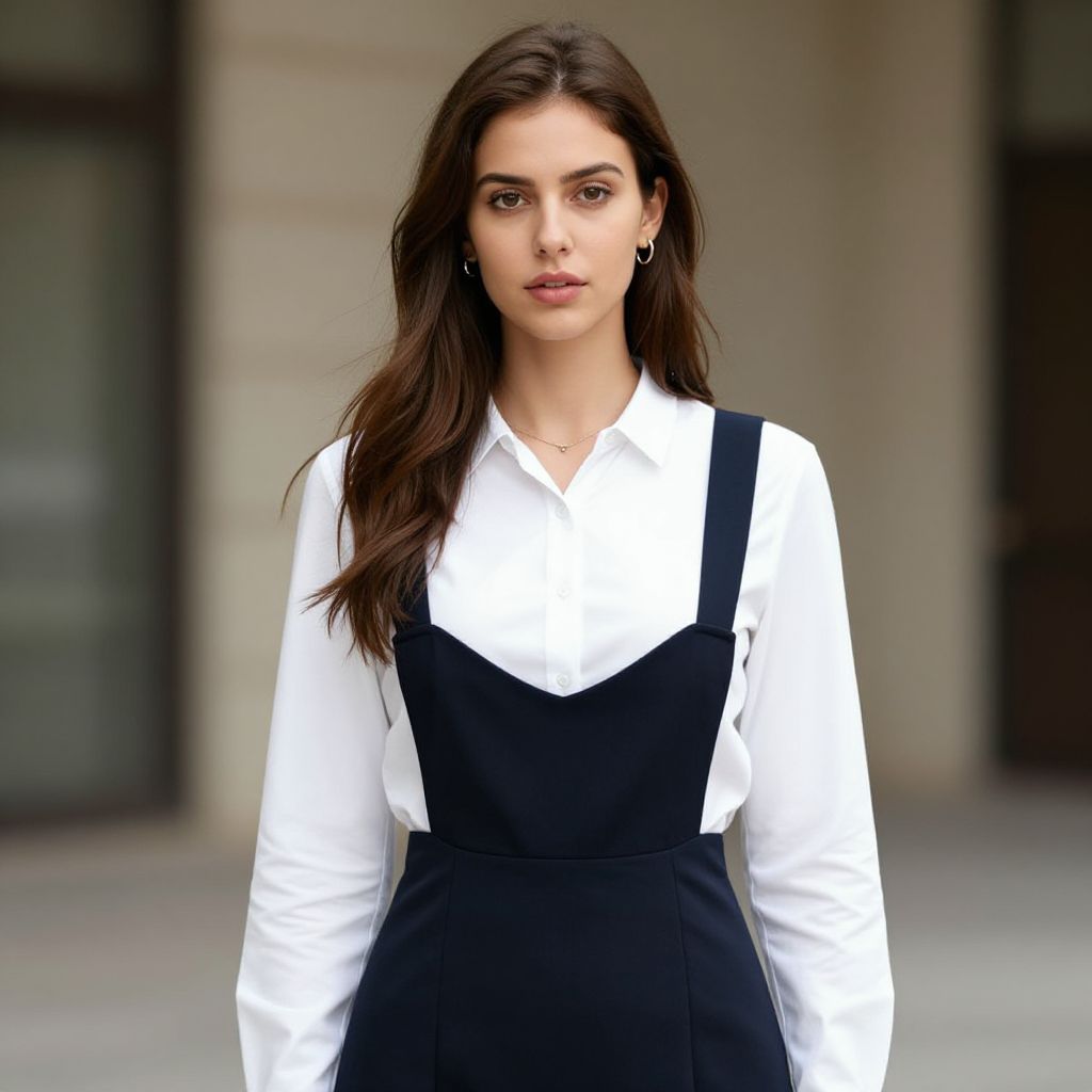 Woman pinafore dress, 1girl, solo, brown hair, realistic, long hair, jewelry, shirt, looking at viewer, white shirt, overalls, lips, earrings, long sleeves