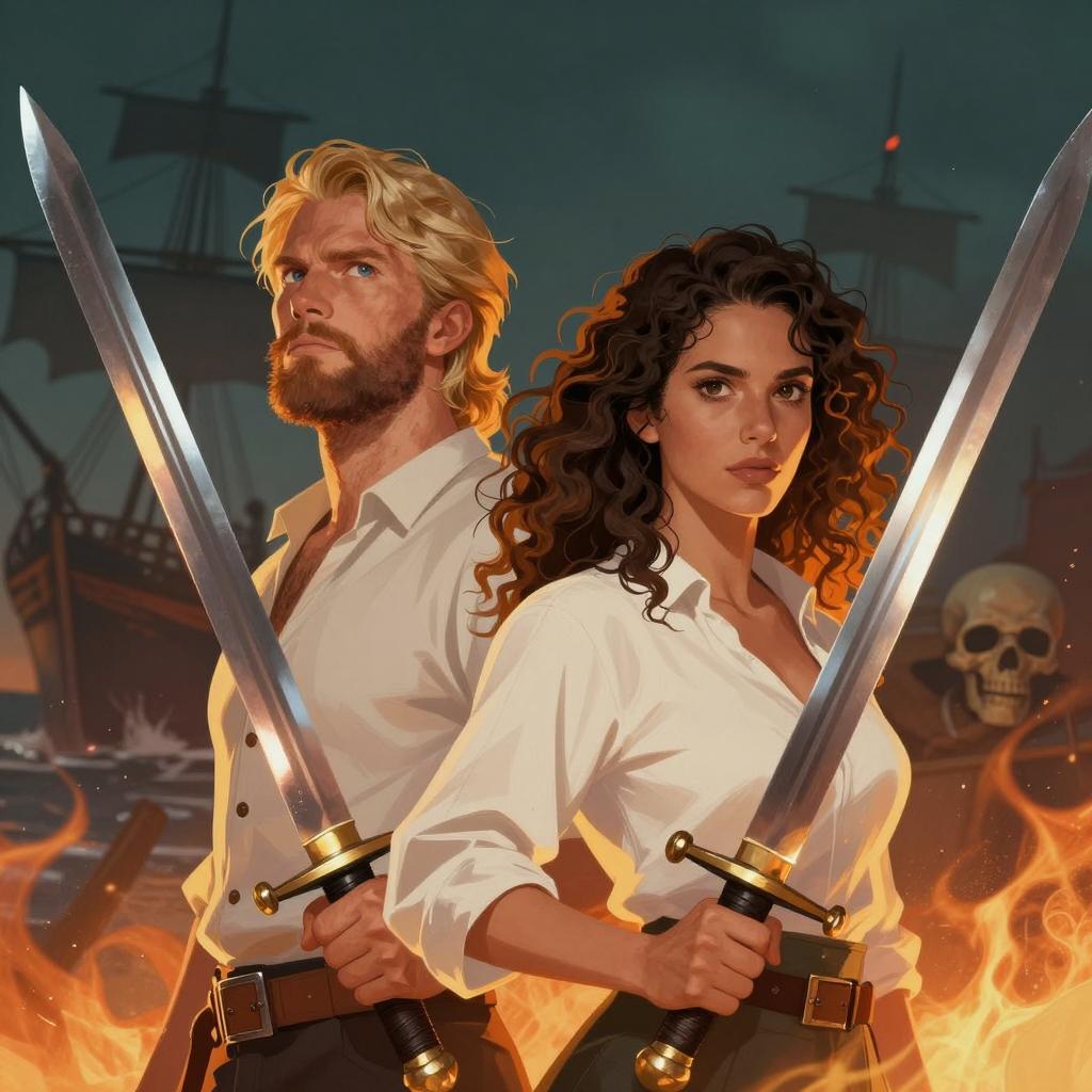 Digital illustration. Two people with swords, front and center. Man with blond hair and beard on left, woman with curly brown hair on right. Both wear white shirts, swords crossed over their shoulders. Background: dark, teal, and fiery, with a ship and skull in the distance. Flames on the right, sparks throughout. Intense expressions. One person on the left looks up, woman looks forward.