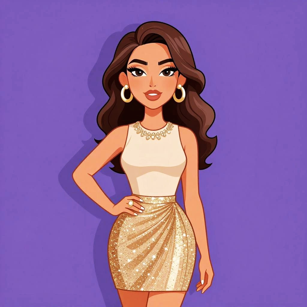 Woman with pretty face and pretty hair. Woman, glam, sleeveless beige blouse with embellished neckline, gold sparkly pleated mini skirt, large statement ring. --sref 1467