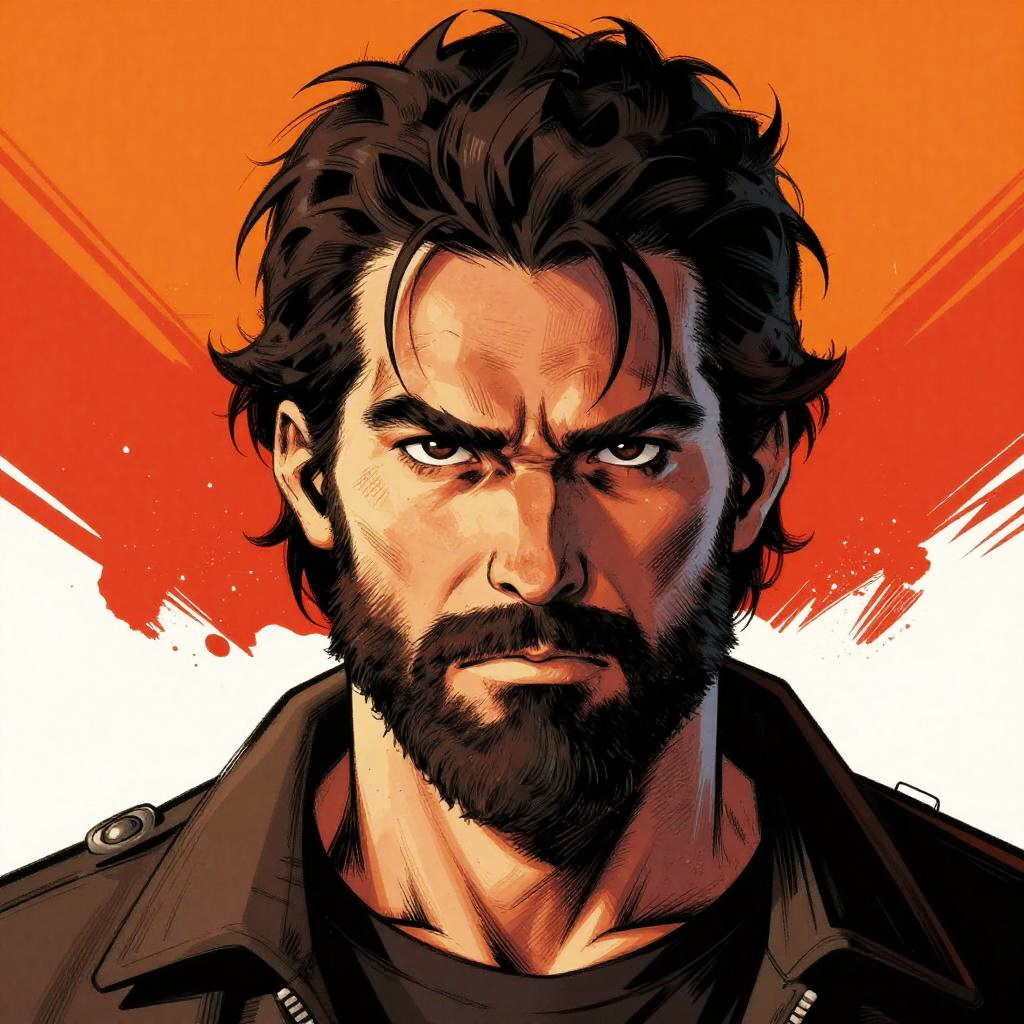 This is a digital drawing of a rugged, bearded man with dark hair and intense eyes. His face is highlighted with bold, dynamic lines, and he has a serious expression. The background is a vibrant mix of orange and red with splashes of white, giving the image a dramatic, energetic feel. The style is comic-like with strong shading and contrasting colors.