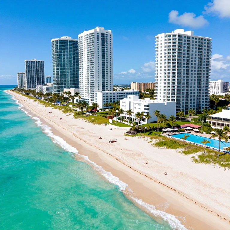 Sunny Isles Beach, Florida, showcases a vibrant coastal scene with turquoise waters meeting golden sands, lined by tall white high-rise buildings featuring balconies, interspersed with lush greenery and a serene pool area.