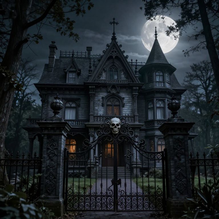A gothic, Victorian-style mansion stands under a full moon, its wrought iron gate adorned with intricate designs and a skull crest, set in a dark, forested landscape.