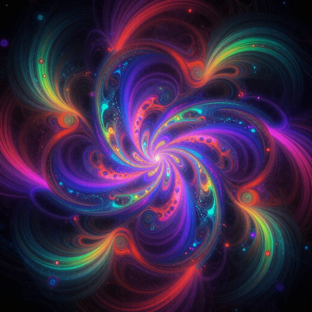 AI fractal generator creating mesmerizing, vibrant patterns with glowing neon colors, intricate recursive geometry blending cyberpunk and organic aesthetics, hyper-detailed digital art, futuristic technology theme, high contrast, deep shadows, surreal ambiance