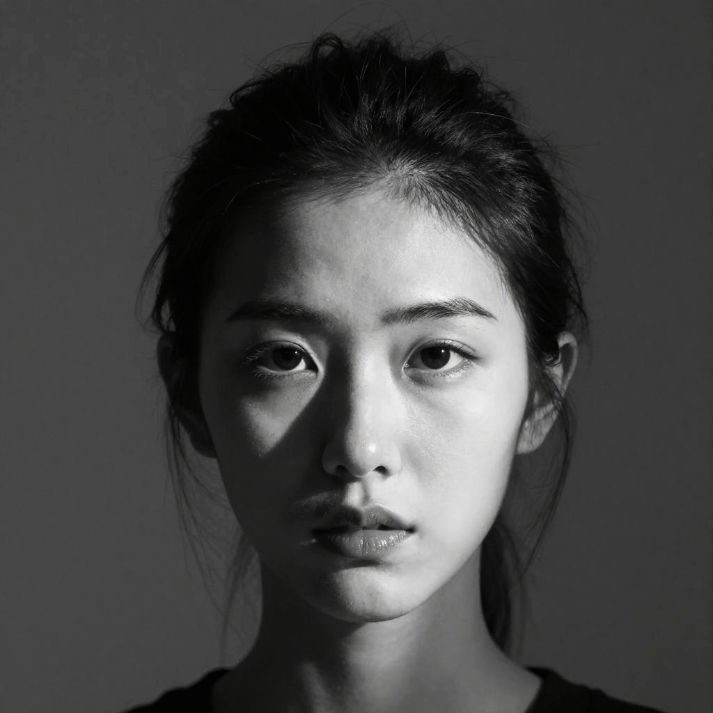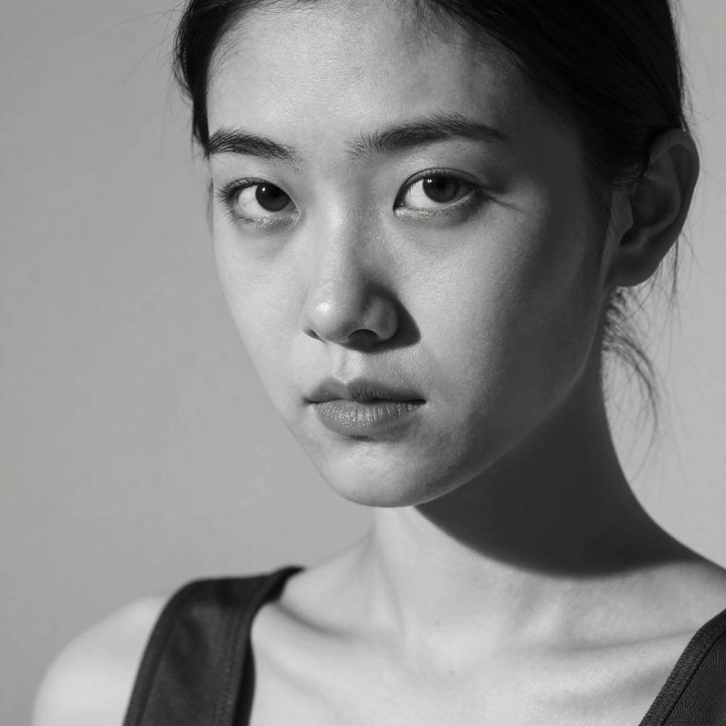 Black-and-white photograph of an East Asian woman with fair skin, dark hair in a ponytail, wearing a sleeveless top, gazing softly into