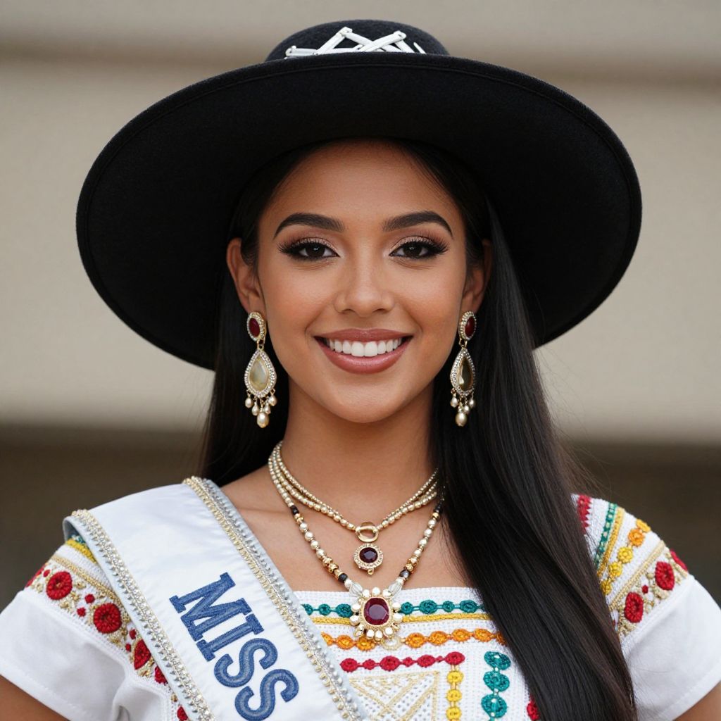 Miss usa traditional costume, 1girl, solo, jewelry, earrings, necklace, long hair, realistic, black hair, hat, looking at viewer, smile, upper body