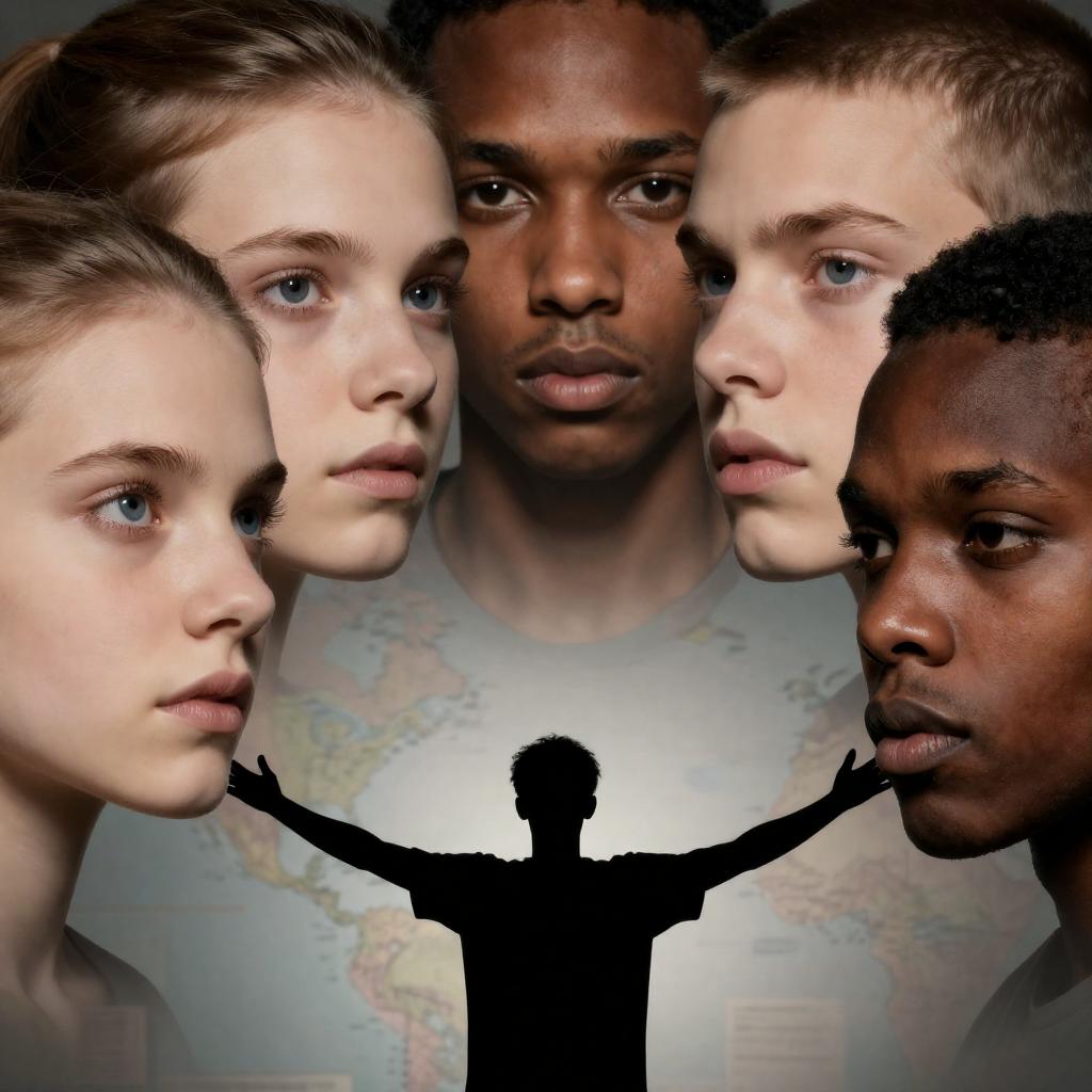 Photograph of six close-up faces, four lighter-skinned and two darker-skinned, with intense expressions. A silhouette of a person with outstretched arms stands below. Background includes a map and abstract ures. Faces positioned top, silhouette bottom center.