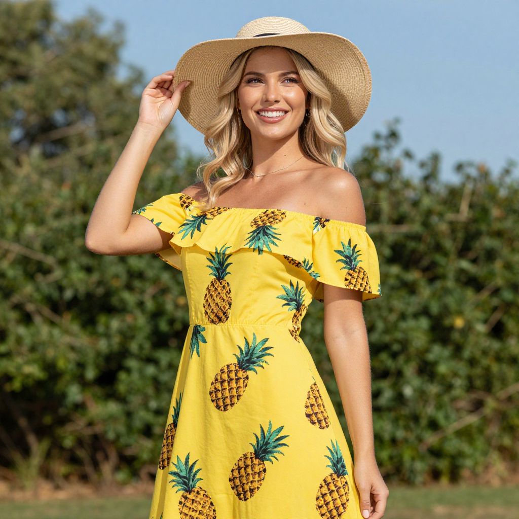 Blonde woman smiling brightly while wearing a vibrant yellow off-the-shoulder dress adorned with pineapple patterns, complemented by a wide-brimmed straw hat, set against a backdrop of lush greenery and a clear blue sky.