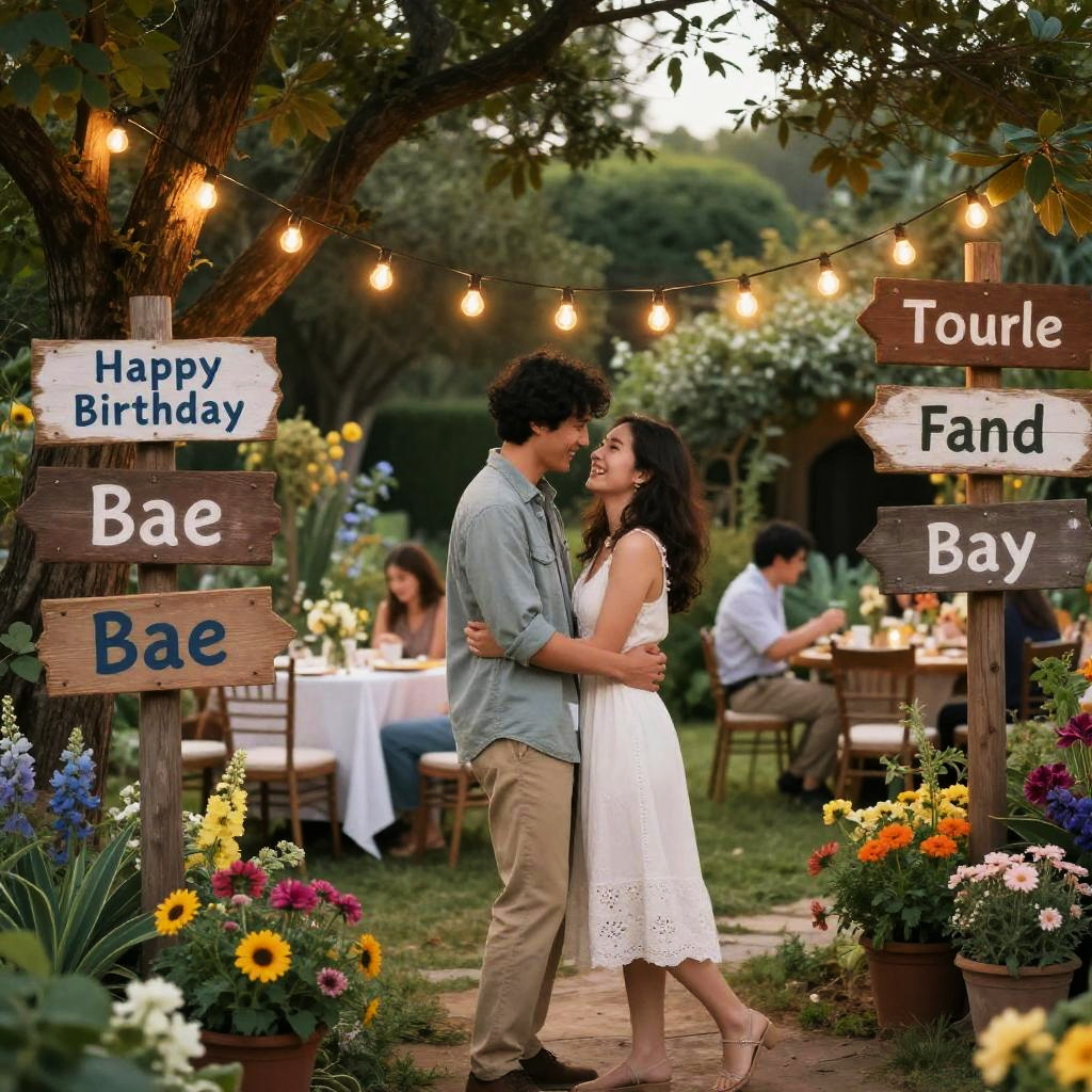 Happy birthday bae images portraying a whimsical garden party at dusk, string lights hanging from trees, colorful flowers, rustic wooden signs, and a joyful couple embracing happily