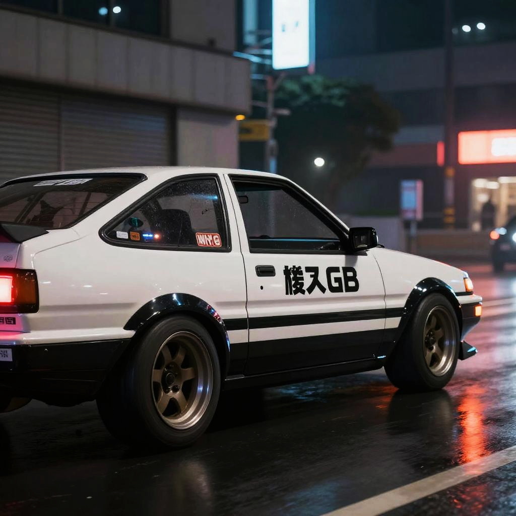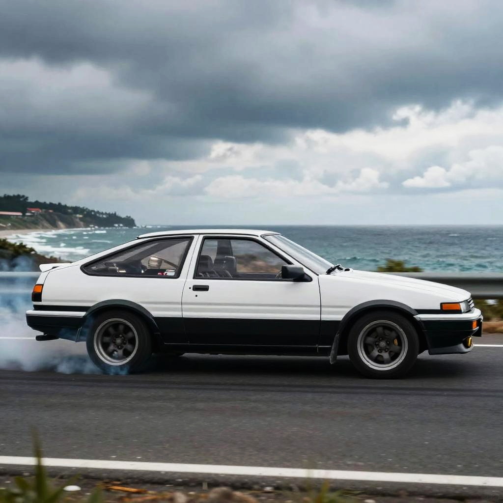 AE86 side profile, sleek vintage Japanese sports car parked on a mountain road at sunset, vibrant orange and white paint, detailed metallic reflections, scenic background with winding roads, cinematic lighting, sharp focus on car contours, realistic style