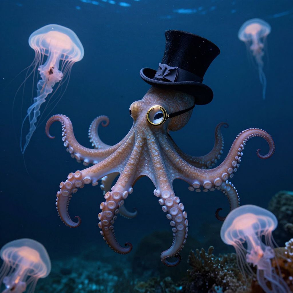 Photograph of a whimsical octopus wearing a black top hat, surrounded by glowing jellyfish in a deep blue underwater scene.