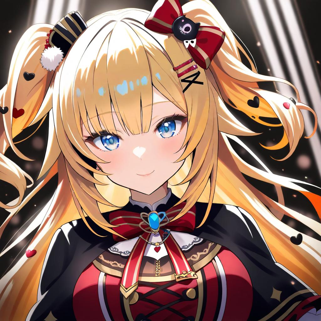 Digital illustration of an anime-style girl with two-tone long orange and white hair, blue eyes, and blunt bangs. She is wearing a white sun hat decorated with a blue ribbon and flower, along with a detailed blue and white outfit featuring a ruffled shirt and jacket. The character has a distinct fang and is smiling against a sparkling, bright background. This artwork includes Japanese text on both sides and reflects a vibrant, stylized anime aesthetic.
