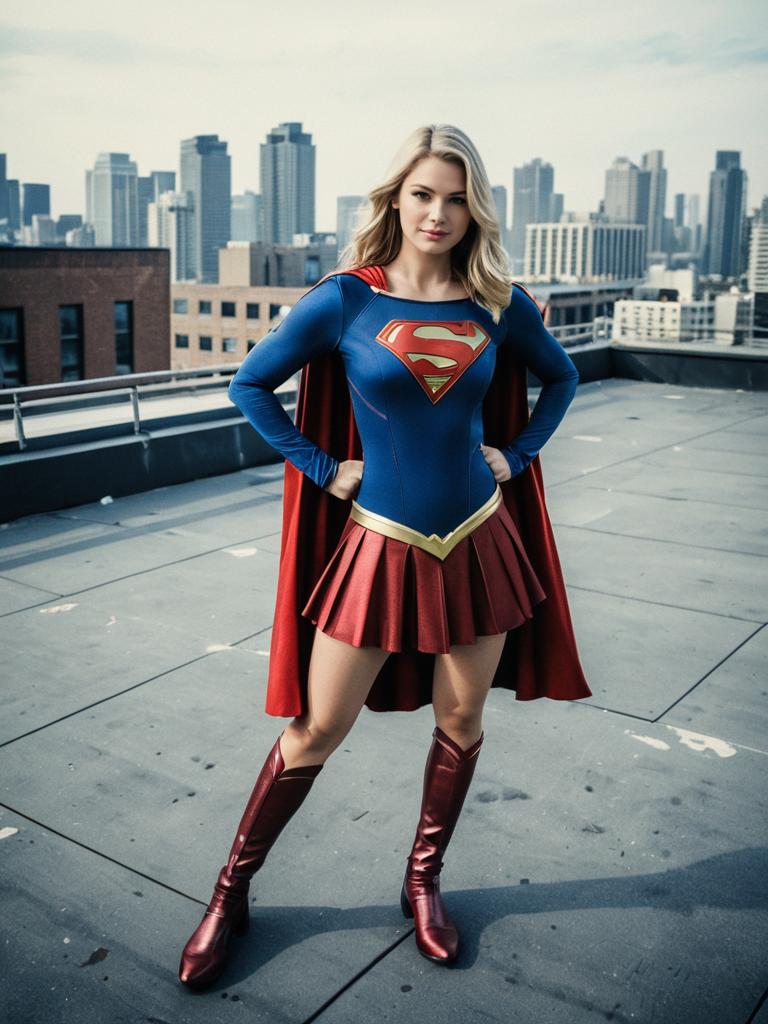Woman in Supergirl costume, full-body cosplay photo in urban rooftop setting