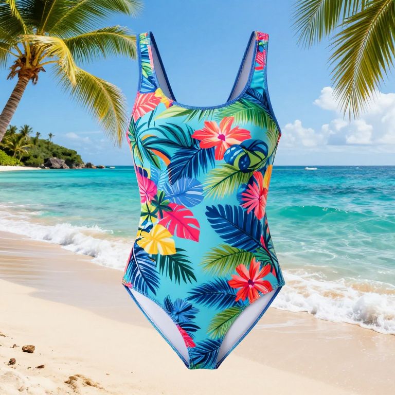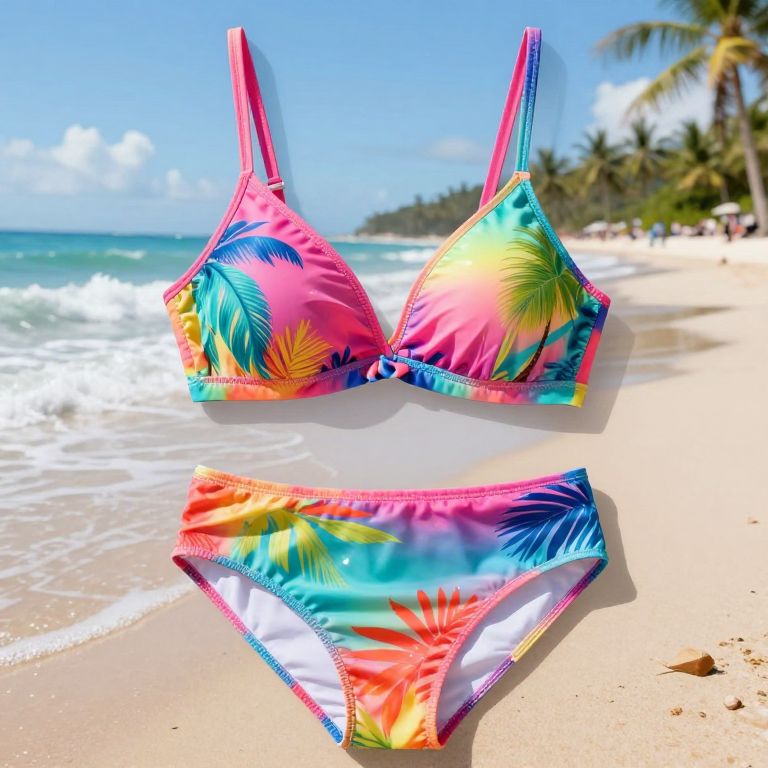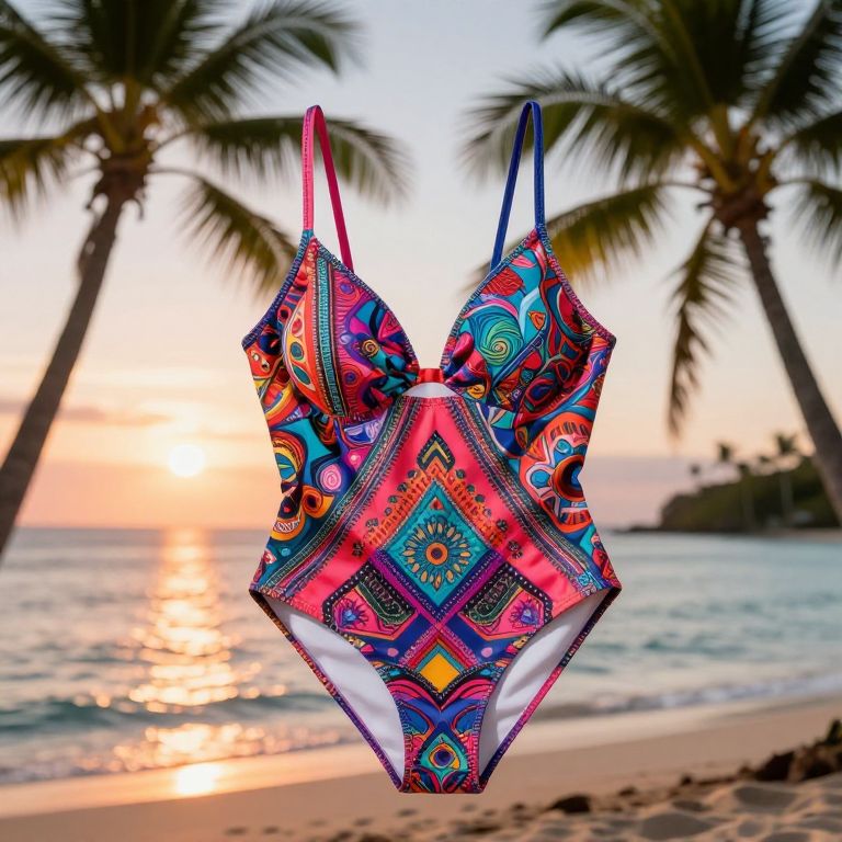 Swimsuit:qekxtw2e-c0= glowing under a radiant sunset on a tropical beach, intricate patterns, vibrant colors, soft waves in the background, photorealistic style, cinematic lighting, high detail