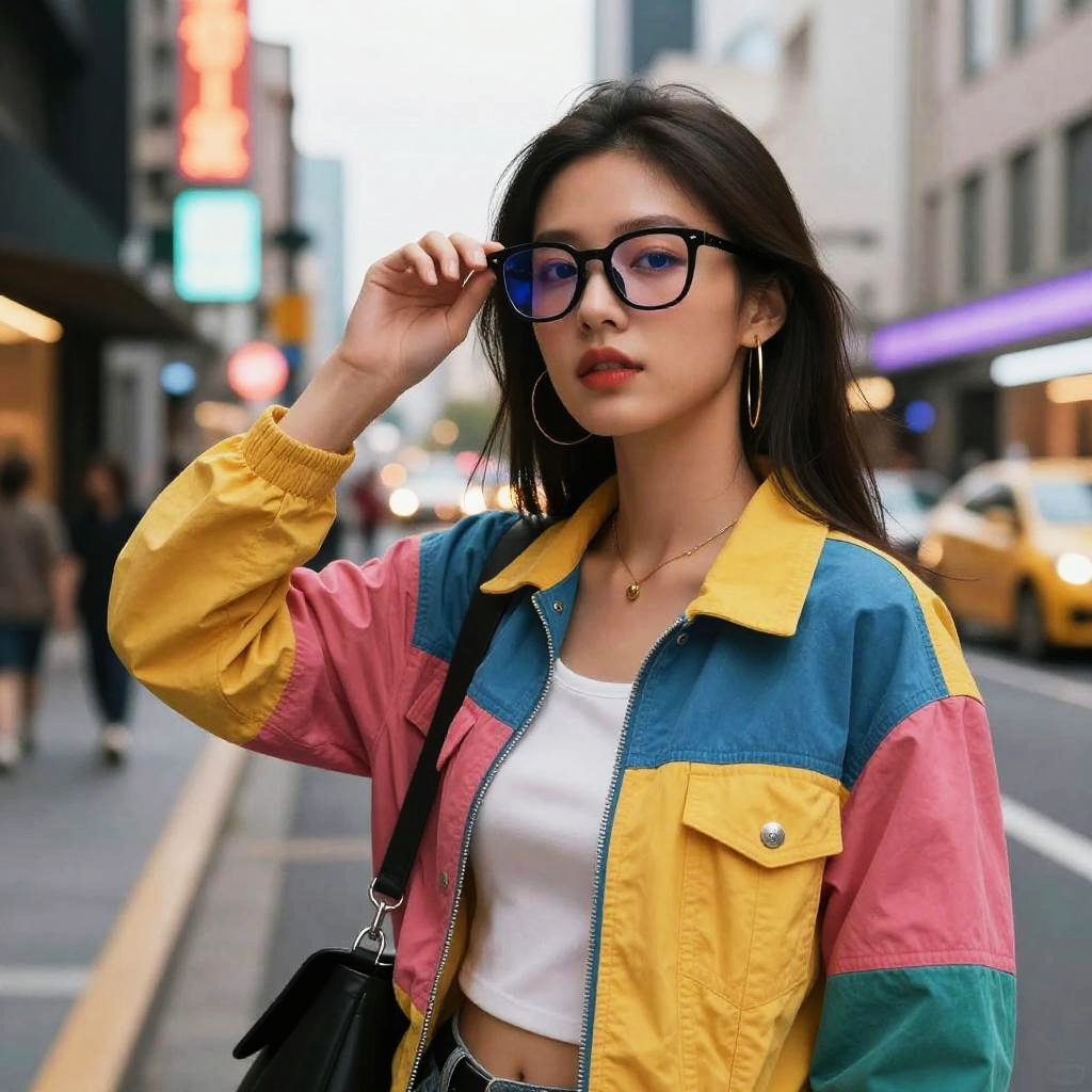 Asian girl glasses, vibrant city street scene, confident young woman in trendy glasses, colorful streetwear, dynamic pose, evening neon lights reflecting on glasses