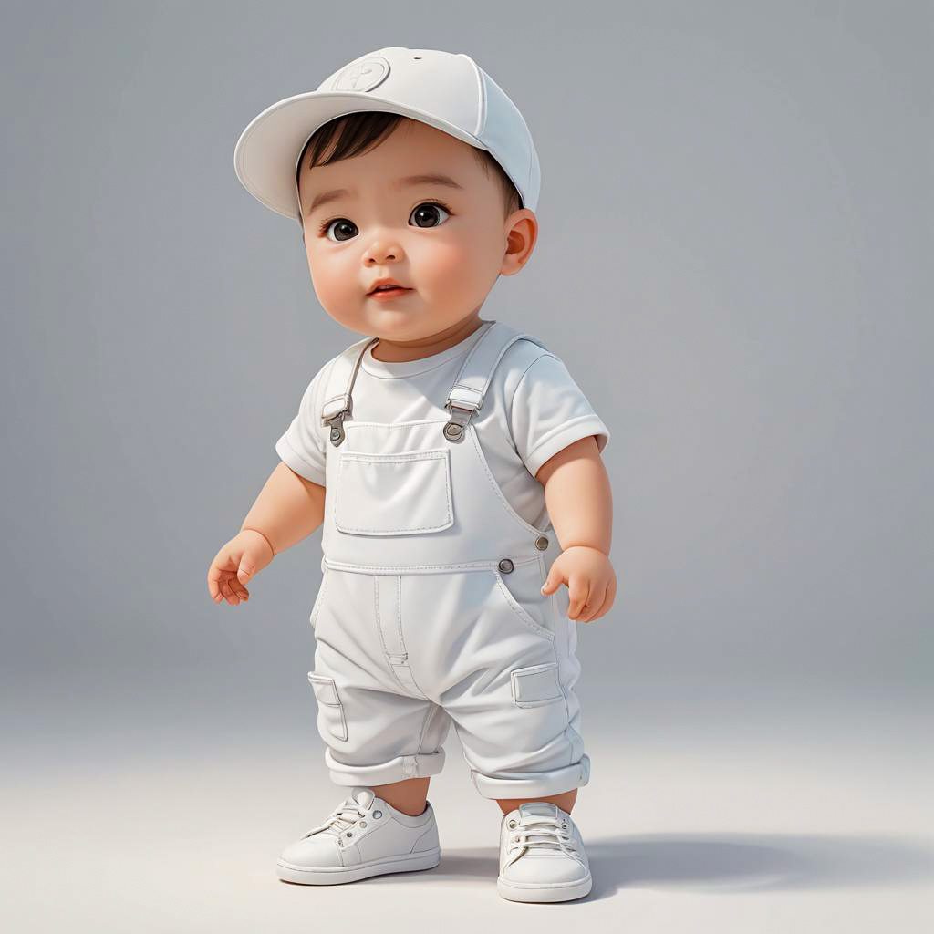 Toddler boy, Chubby, white outfit, white t-shirt with white overalls and white sneakers, cartoon style