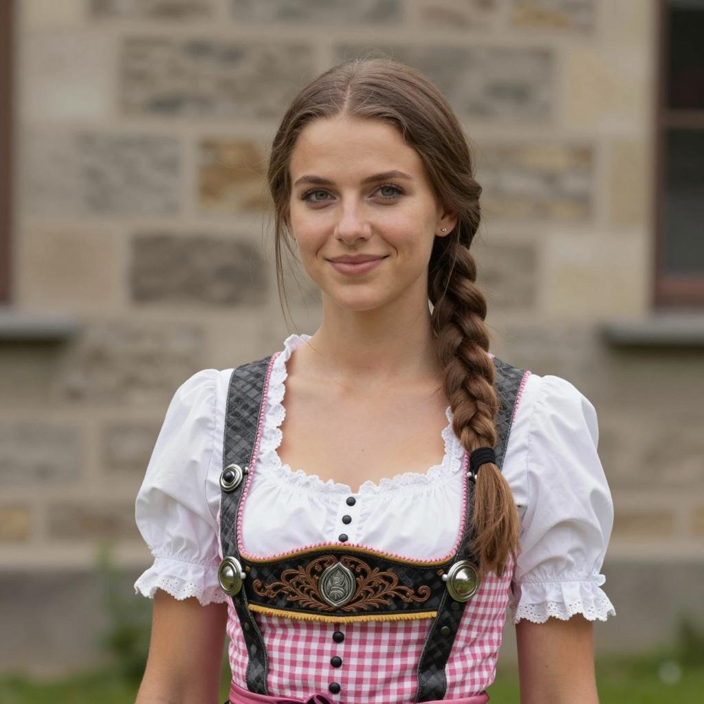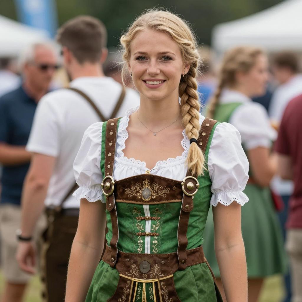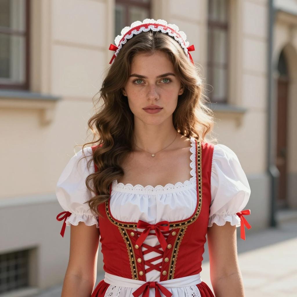 Oktoberfest fancy dress, photorealistic portrait of a young woman, Renaissance festival, German dirndl outfit, red and brown dress with black buttons, white lace trim, puffed sleeves, red bow at waist, white frilled headpiece with red roses, braided blonde hair, serious expression, fair skin, outdoor setting, blurred background with green trees and people, sunlight, daytime, detailed ures, realistic lighting, traditional costume, festive atmosphere