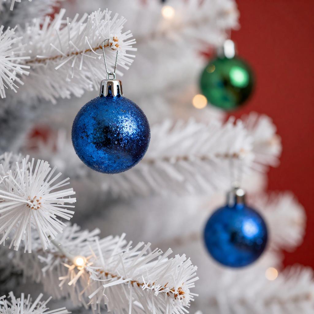 White artificial Christmas tree with blue glittery ornaments, white lights, and blurred green ornaments in the background. Tree branches have a frosty ure. Bright red background. Two prominent blue ornaments, one in focus, one slightly out of focus.