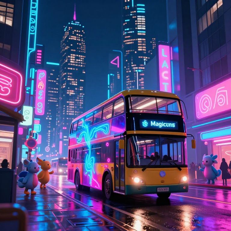 Magicbus weaving through a vibrant neon cityscape at night, glowing windows and electric colors reflecting on wet streets, a futuristic urban fantasy scene with glowing runes and whimsical creatures surrounding the bus