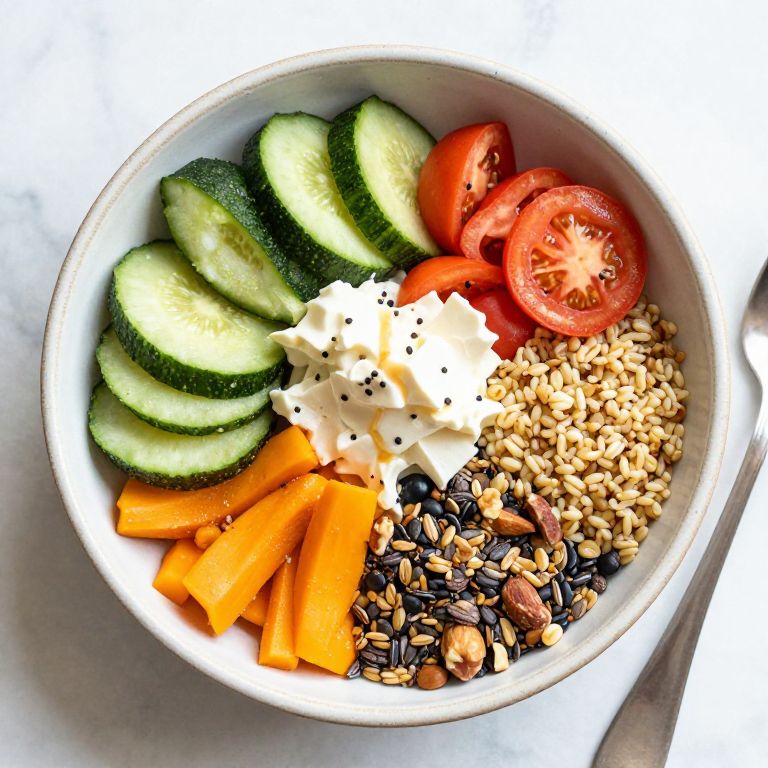 Comida vibrant vegan bowl filled with colorful fresh vegetables, grains, nuts, and seeds, bright natural light, health-focused aesthetic, rustic ceramic bowl, overhead composition