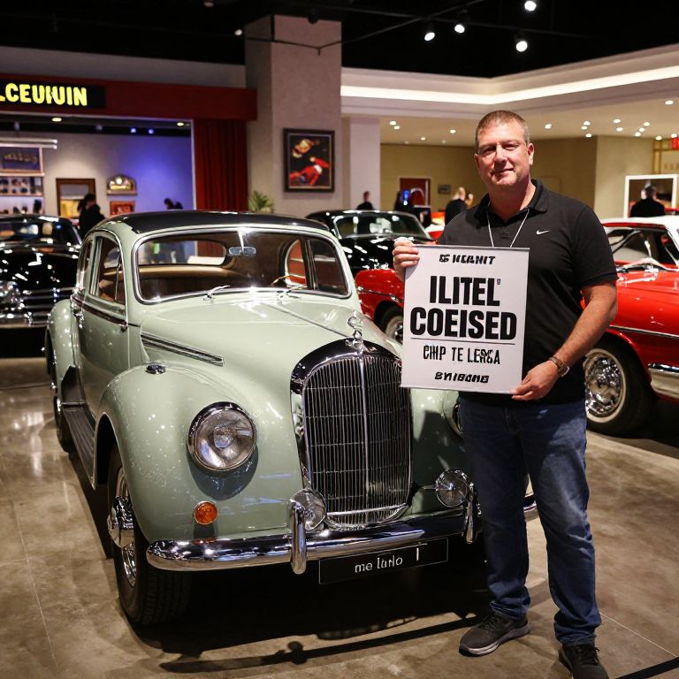 Photograph of a middle-aged man with short hair, wearing a black polo shirt and jeans, standing beside a mint-green classic car, holding a "