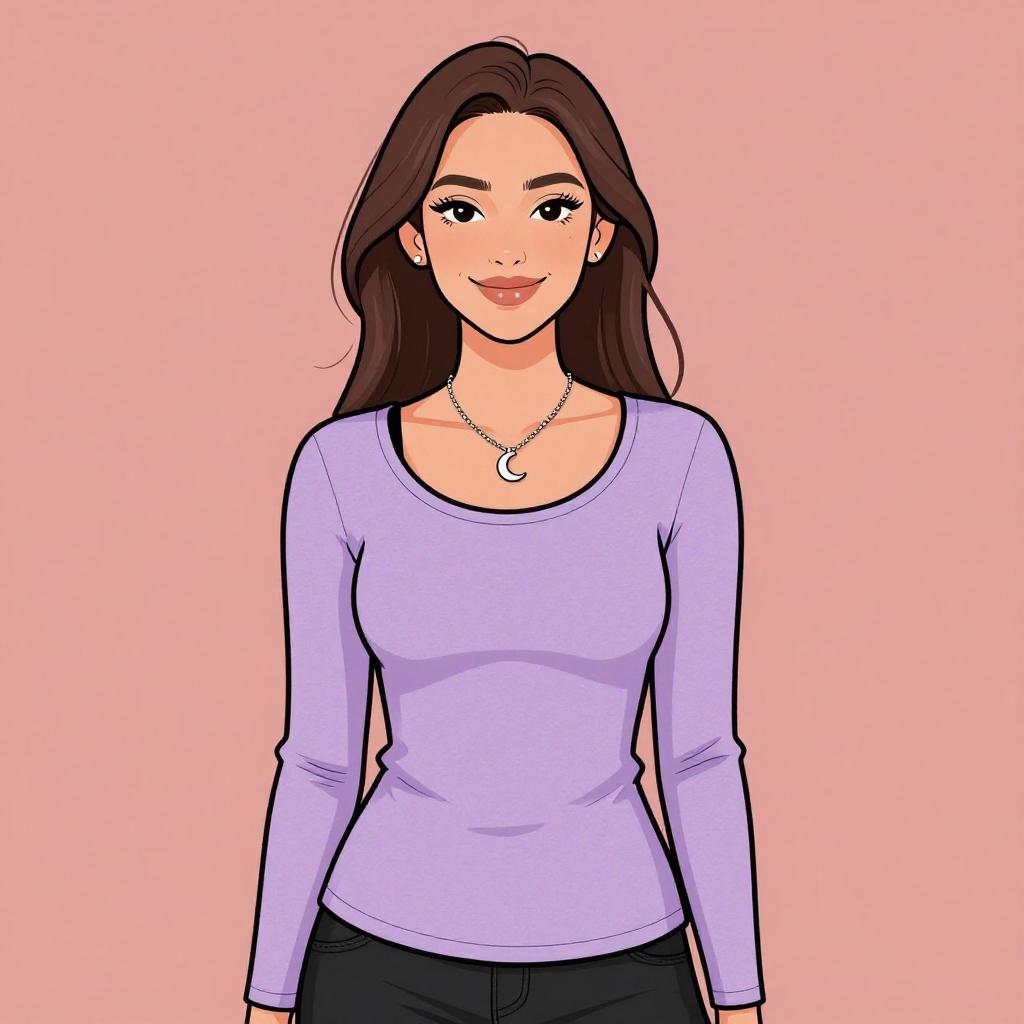Digital illustration of a smiling woman with brown hair, wearing a pink t-shirt, blue jeans, and large hoop earrings, standing against a plain white background