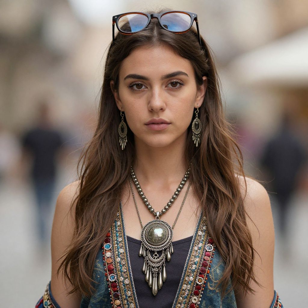 Modern bohemian costume, 1girl, solo, jewelry, necklace, brown hair, long hair, looking at viewer, earrings, blurry background, realistic, blurry, eyewear on head, artist name, scarf, closed mouth