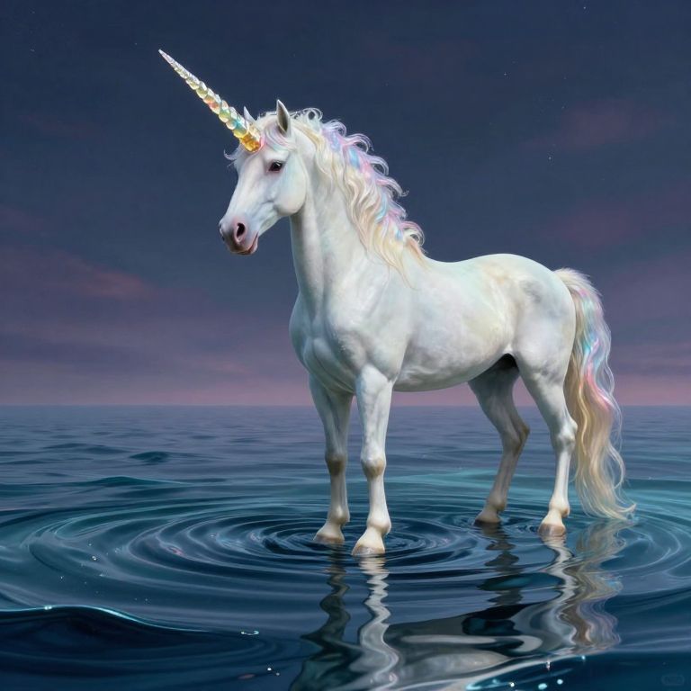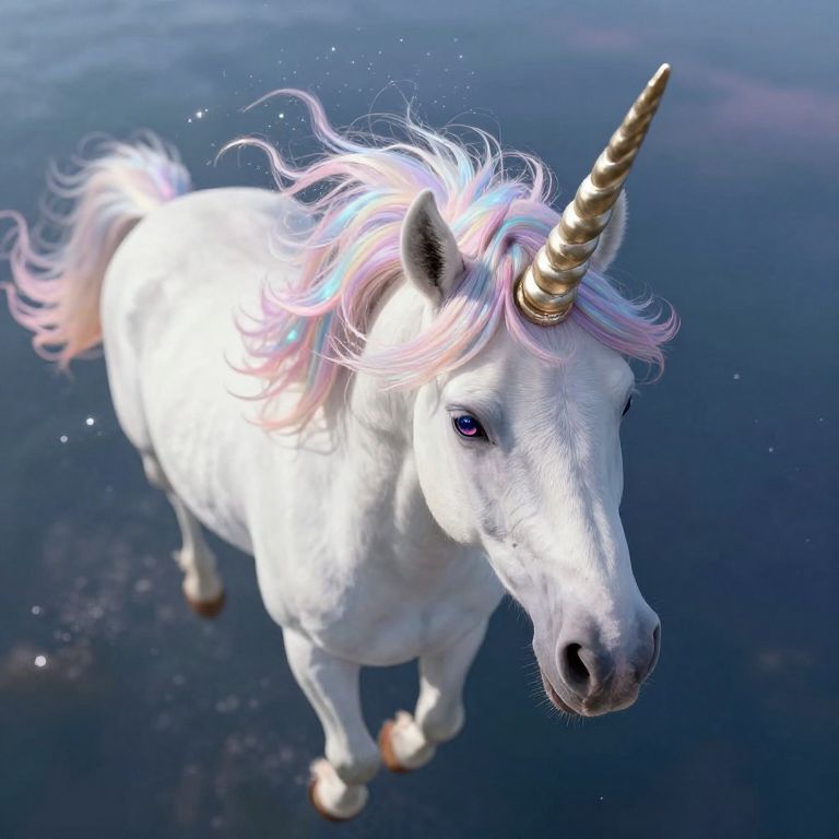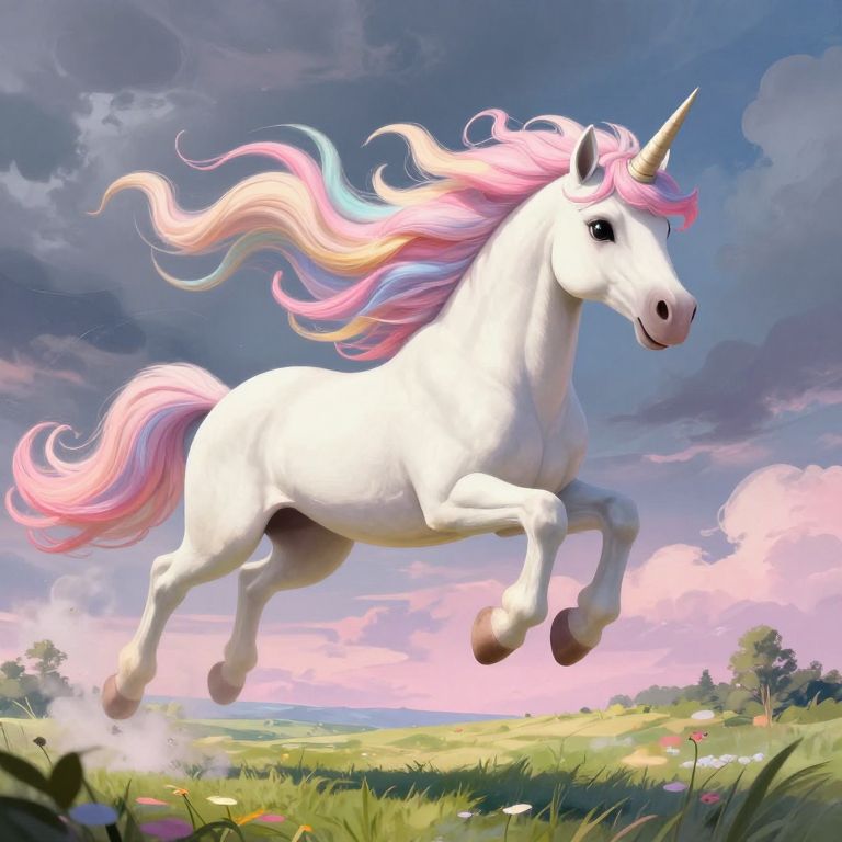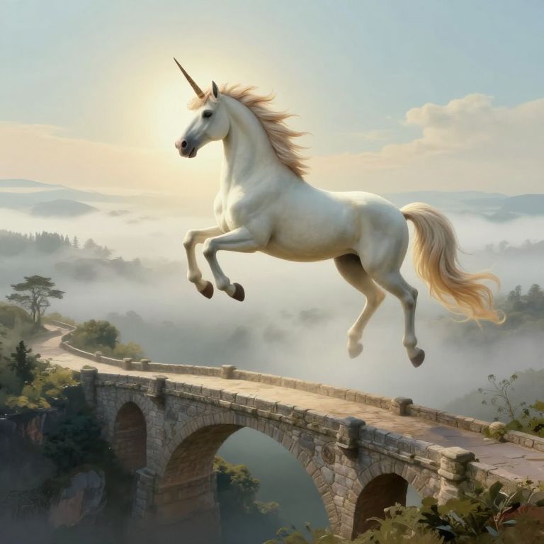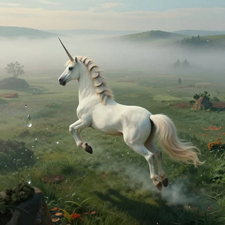 An imaginative digital art piece merges whimsical storytelling with surrealistic visuals, depicting a majestic unicorn gracefully descending through a lush, misty forest. The iridescent mane of the ethereal creature shimmers in dappled sunlight as it appears to float amidst an enchanting dreamscape captured from a bird's-eye view above the treetops. The color palette consists of soft pastel hues with delicate accents of gold and silver, adding to the magical aura that envelops this extraordinary vision of fantasy.
