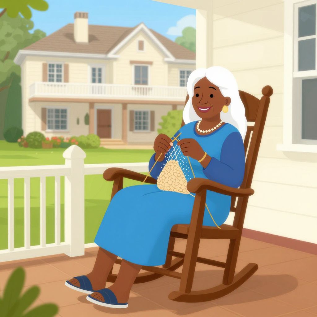 Digital illustration of a smiling, dark-skinned elderly woman with white hair, wearing a blue dress, pearls, and blue sandals, knitting on a porch
