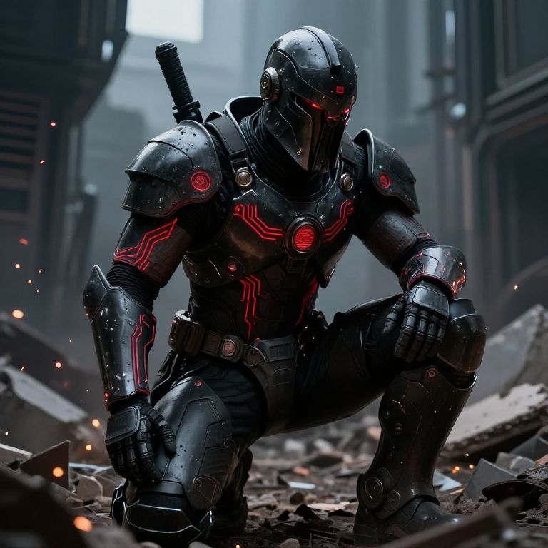 Photorealistic digital artwork of a futuristic, armored warrior crouching in a ruined, dark urban environment. The warrior, clad in black, glossy, high-tech armor with red glowing circuitry patterns, has a helmet with a red eye visor. A sword is sheathed on their back. The background features broken debris and dim, bluish light filtering through the rubble. The warrior's muscular build and poised stance suggest readiness for combat. Small, glowing embers float in the air, adding a sense of tension and danger.