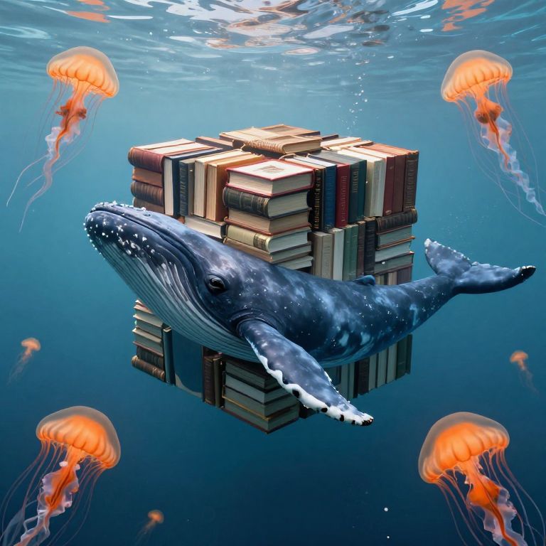 Digital artwork: A blue whale swims around a cube of stacked books, surrounded by glowing orange jellyfish in a clear blue ocean.