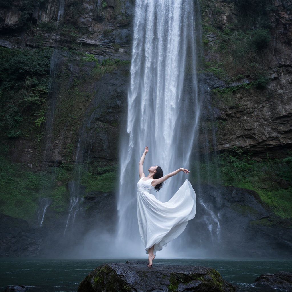 A woman in a flowing white dress dances gracefully on a rock above a waterfall, surrounded by lush greenery and towering cliffs.