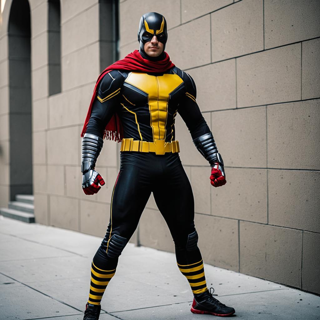 Bishop Marvel Comics, cosplay costume athletic male wearing black and yellow striped costume with red scarf and fingerless gloves, full body shot, depth of field