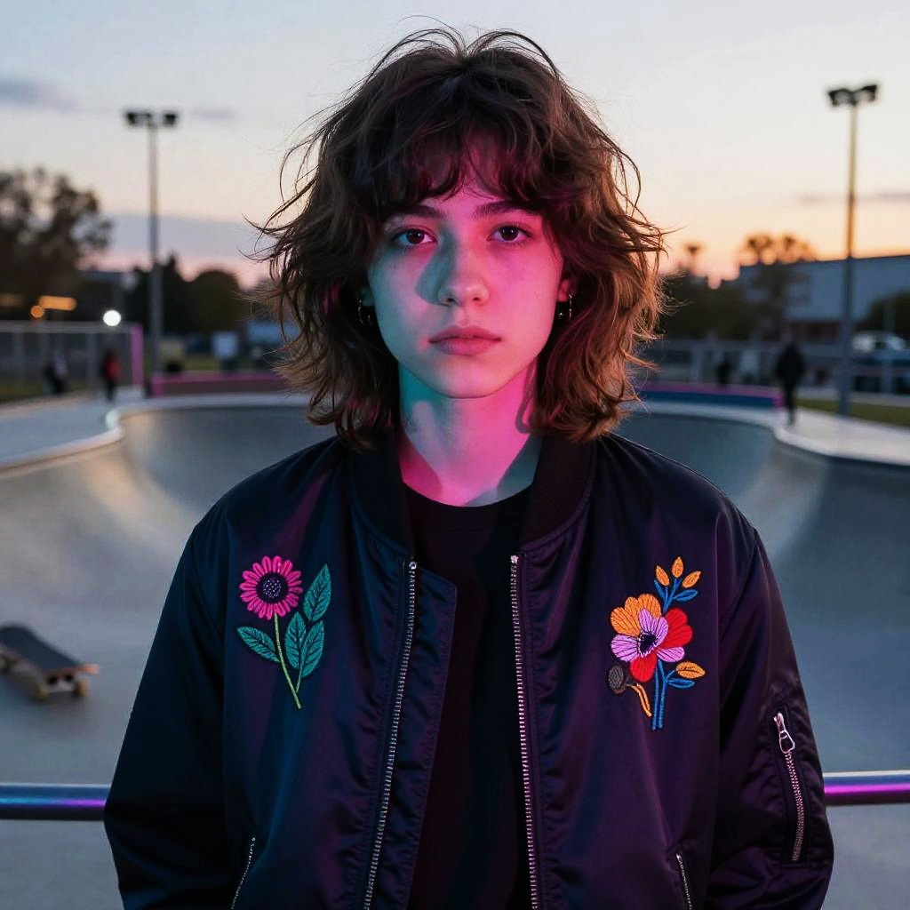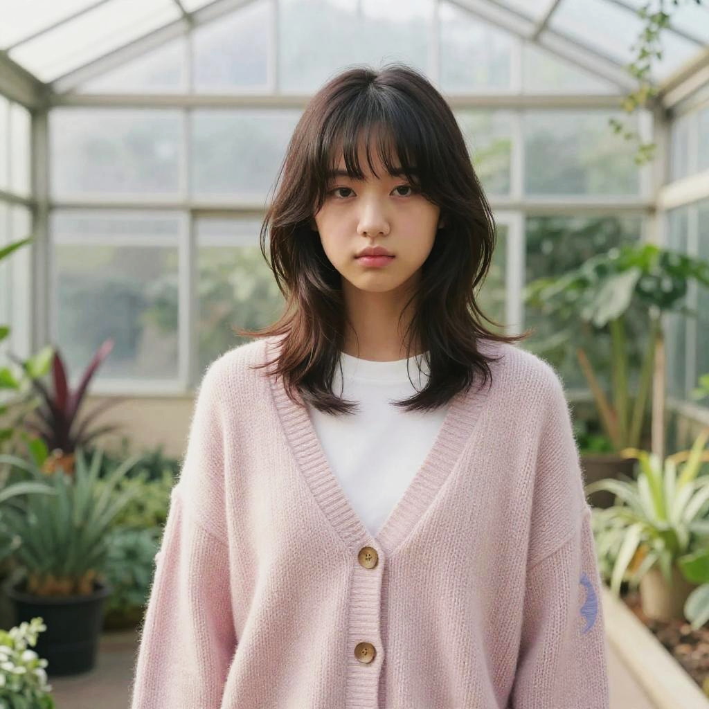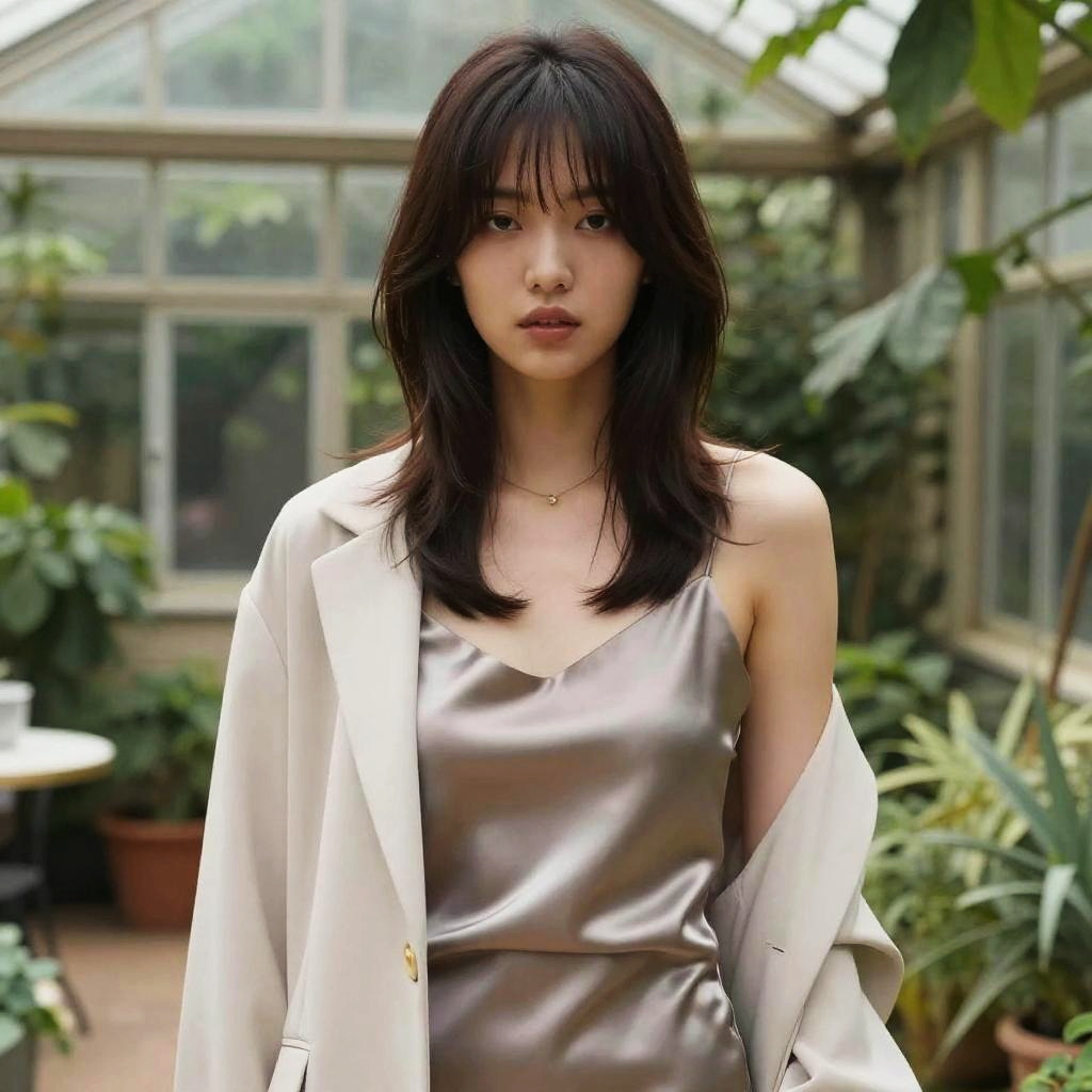 Layered Bangs hairstyle on young girl, wearing floral blouse, in city rooftop, captured in fashion editorial style with golden hour glow.