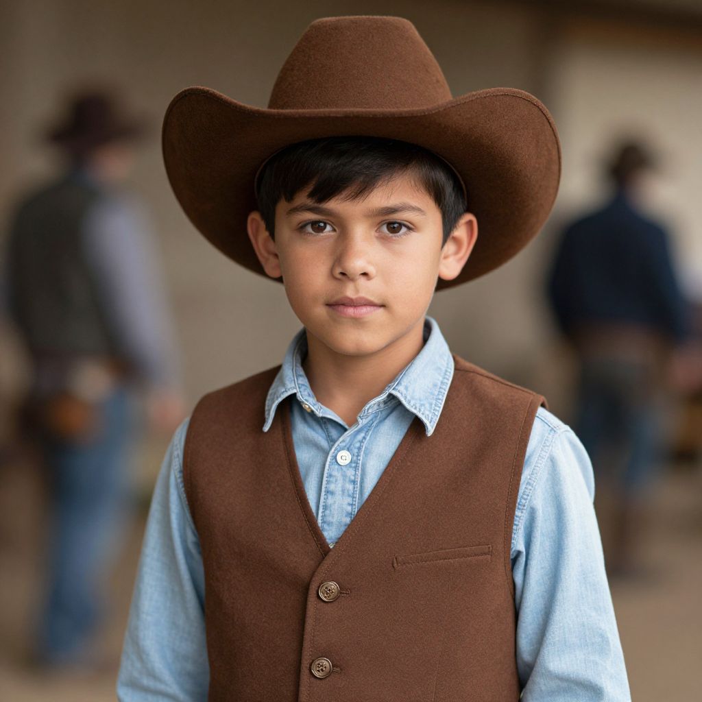 Photograph of a young boy with medium brown skin and short black hair, wearing a brown cowboy hat, light blue button-up shirt, and brown vest. He stands in a slightly blurred outdoor setting with two indistinct men in the background, one wearing a hat. The boy's expression is neutral, and the image has a soft focus, emphasizing the boy's face and attire. The background colors are muted, with shades of beige and brown, creating a rustic feel. The boy's vest has two visible buttons, and his shirt's collar is neatly pressed.