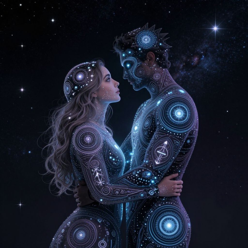Two cosmic figures, a star-headed man and woman, embrace in a starry, celestial setting, adorned with intricate, glowing patterns and symbols, set against a dark, star-filled background, creating a surreal, hyper-realistic, avant-garde visual experience.