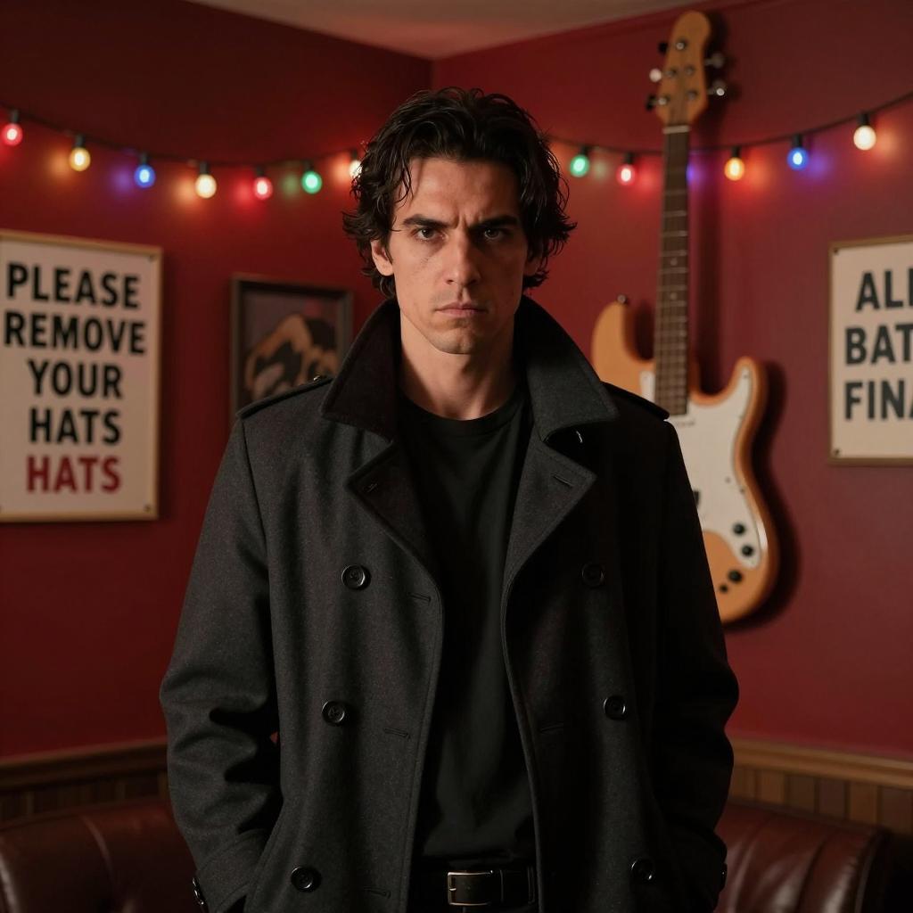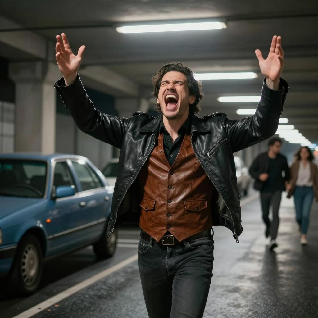 Man with dark hair, leather jacket, and black shirt, arms outstretched, standing in dimly lit bar. Two blurred men in background, seated at table. Green lights on wall. Dramatic lighting, intense expression. Bar setting.