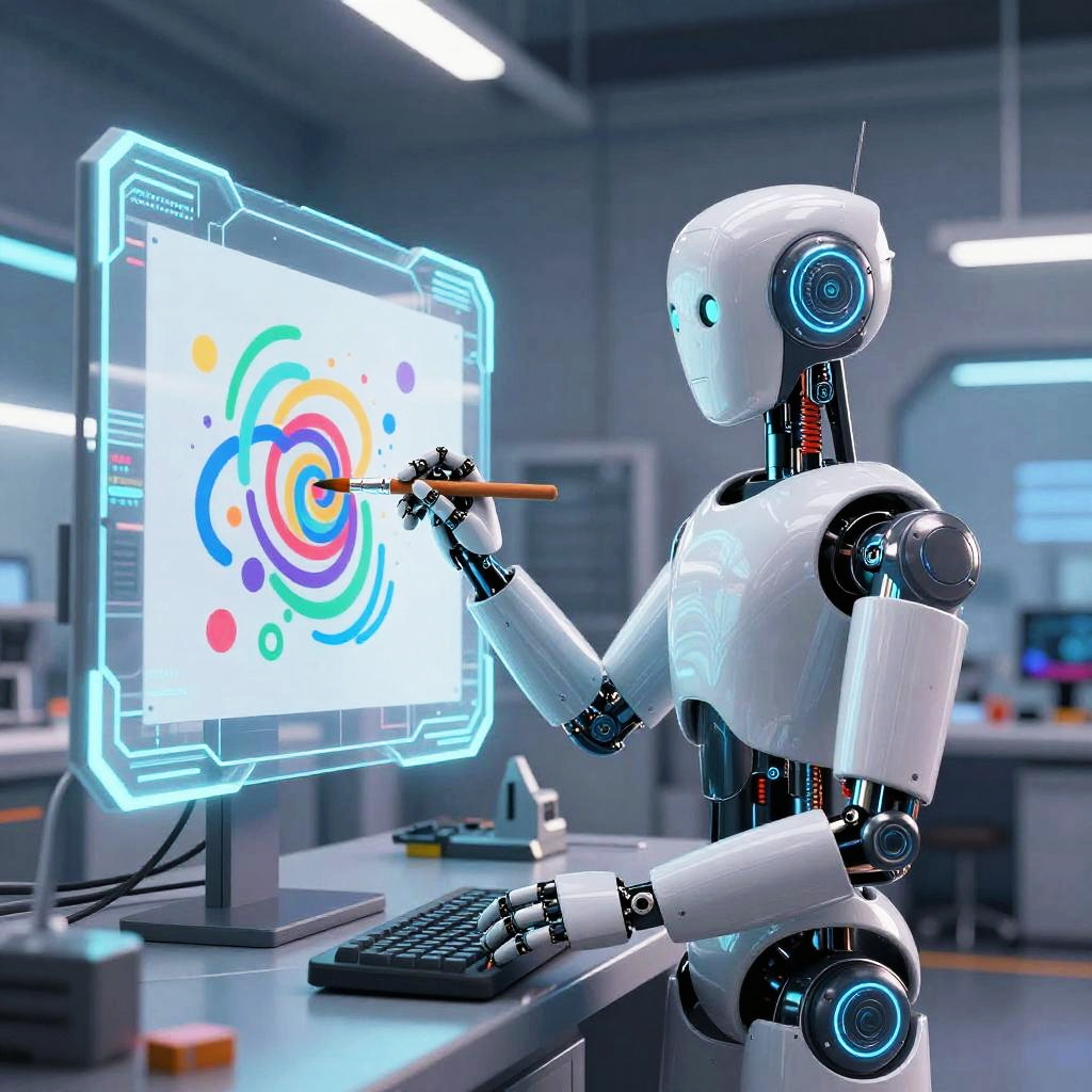 Al creator concept showing a humanoid robot with a paintbrush and keyboard, creating dynamic artwork on transparent floating screens, against a backdrop of advanced tech lab filled with circuits and ambient lighting, digital illustration style