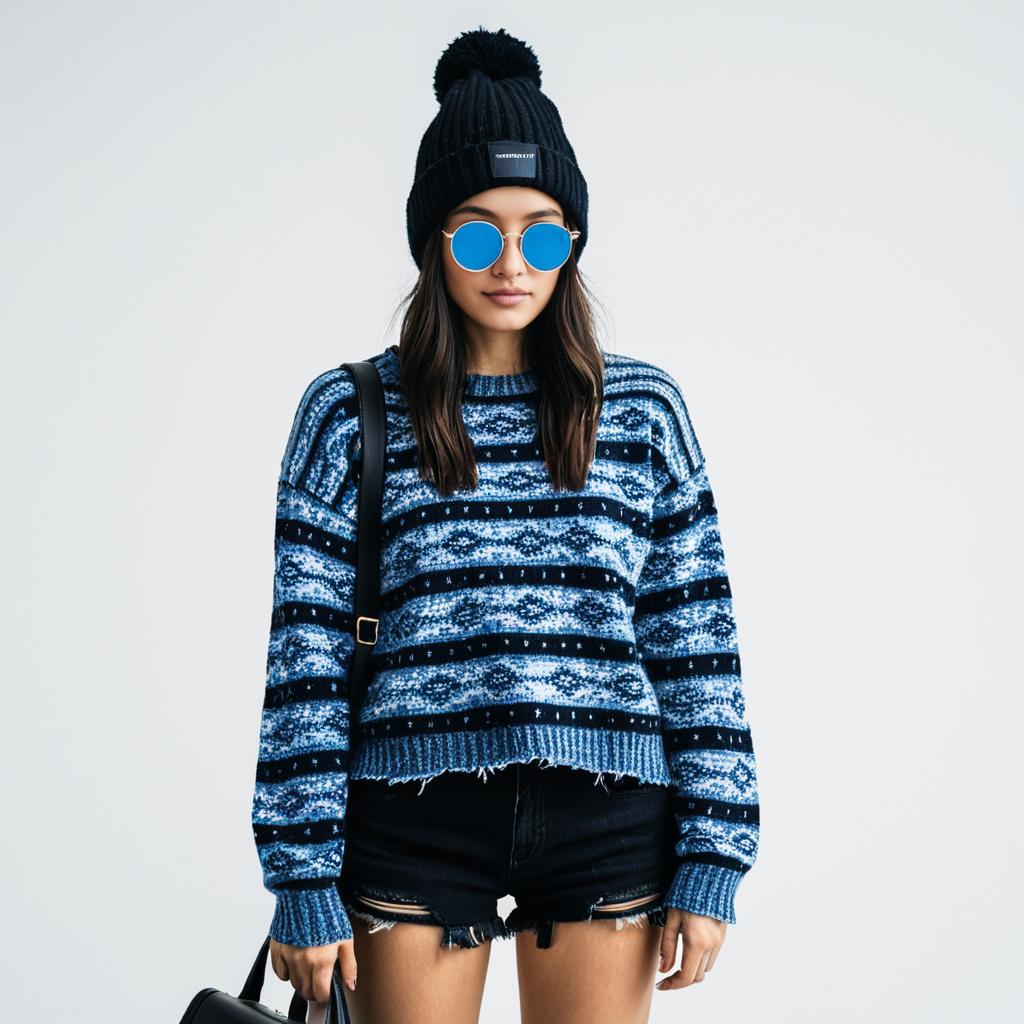 Woman, casual streetwear, pixelated pattern sweater in shades of blue and black, crew neck, long sleeves, frayed black denim shorts, black beanie, round mirrored sunglasses in blue, black shoulder bag, plain white background.