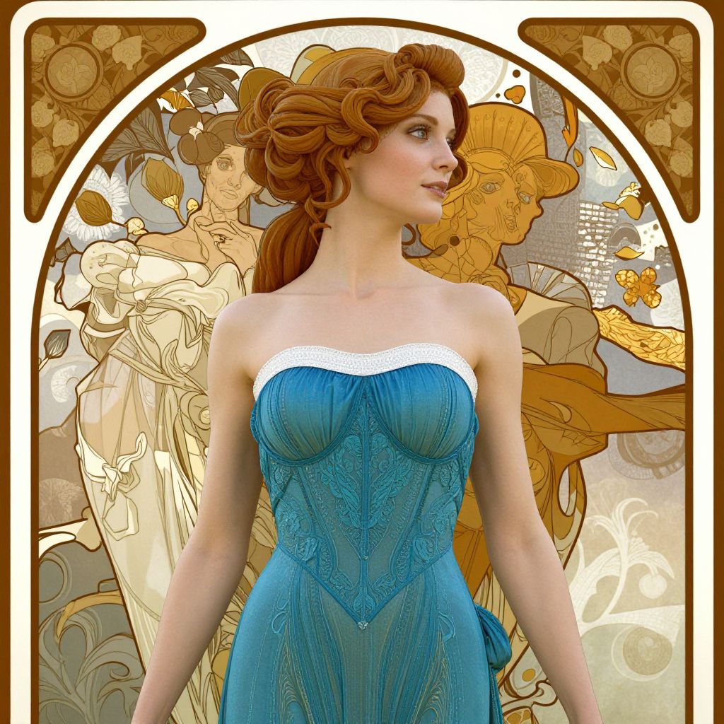 Elegant alien in a blue cutout dress with white trim, as seen on artgerm, octane render, in the style of alphonse mucha, ultra realistic, highly detailed, 8 k