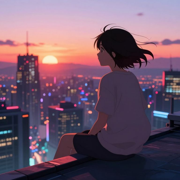 Anime girls black hair, dramatic rain scene on a rooftop, droplets on shiny hair, intense gaze, dark moody tones contrasted with bright city lights, cinematic composition, anime style