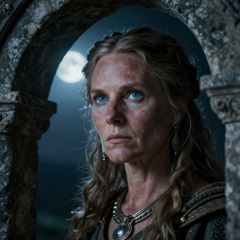 A photorealistic portrait photograph reveals a Nordic seer with piercing blue eyes, her enigmatic gaze emanating from beneath ancient stone archways illuminated by ethereal moonlight. The intricate details of her weathered skin and delicate silver jewelry hint at the wisdom held within her captivating presence, evoking an emotional gradient that balances reverence for her lineage with intrigue over the secrets she guards.